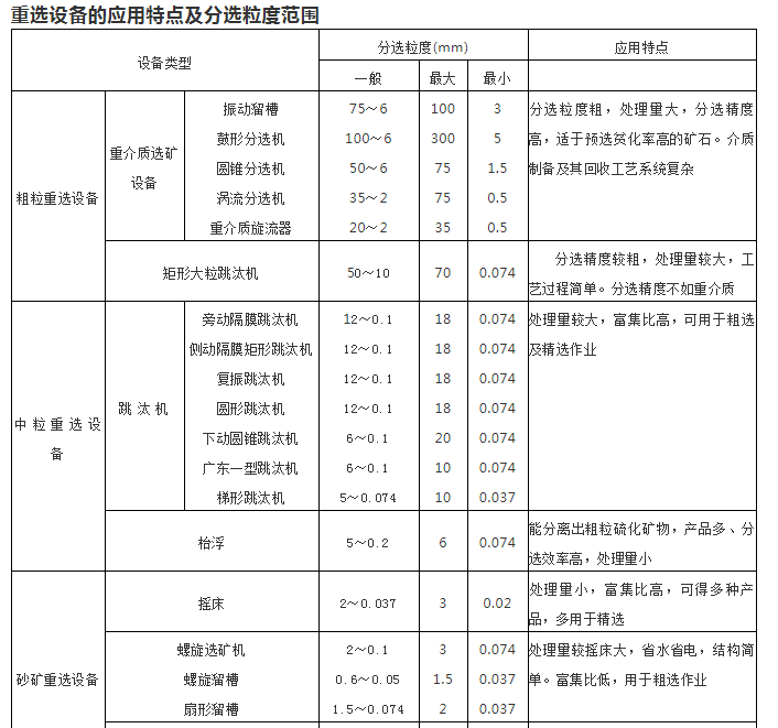 下表列出了各類重選設(shè)備的應(yīng)用特點(diǎn)及分選粒度范圍,供選型時(shí)參考。